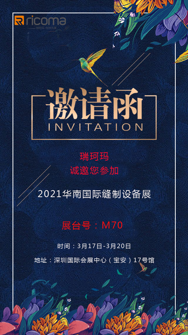 冬去春來,花開枝頭,佳期如許。瑞珂瑪開年首秀參加2021大灣區(qū)國際智能紡織制衣、鞋機(jī)鞋材工業(yè)設(shè)備展(以下簡稱“DTC&DFM展”)、華南國際縫制設(shè)備展(以下簡稱“SCISMA展”)。